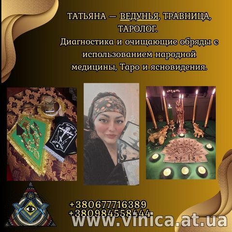 Ясновидящая и таролог. Гадание, магическая помощь, снятие порчи. Татьяна — специалист с большим опытом в сфере эзотерики, магии и траволечения. Она помогает людям восстановить здоровье, наладить личную жизнь, защититься от негатива и найти внутреннюю гармонию. В своей практике использует проверенные методы и древние знания. Услуги Татьяны: -Лечение травами. Натуральные средства при заболеваниях печени, ЖКТ, груди, репродуктивной системы. -Поддержка при беременности, помощь в сложных случаях (включая опухоли и онкологию). -Снятие порчи, сглаза, проклятий. Проведение ритуалов для очищения энергетического поля и защиты от внешнего негатива. -Переклады болезней. Работа с причиной заболевания на энергетическом уровне. -Работа с родовыми программами. Очищение от негативных влияний, восстановление энергетического баланса. -Любовная магия. Возврат отношений, устранение одиночества, привлечение достойного партнёра, укрепление пары. -Гадания и предсказания. Карты Таро, диагностика по фотографии, ответы на волнующие вопросы, помощь в принятии решений. -Финансовая магия. Ритуалы на привлечение денег, успех в делах, открытие финансовых каналов. -Изготовление амулетов и талисманов. Индивидуальная работа — защита от негатива, усиление личной энергии, помощь в достижении целей. Татьяна проводит приёмы в Киеве, а также работает дистанционно через мессенджеры. Все консультации проходят строго конфиденциально. Индивидуальный подход к каждой ситуации. Контакты для записи и консультаций: +380984558444 +380677716389 (Viber, WhatsApp, Telegram) Если вы находитесь в сложной жизненной ситуации и ищете помощь, обратитесь к Татьяне. Она поможет найти выход и восстановить равновесие в жизни.